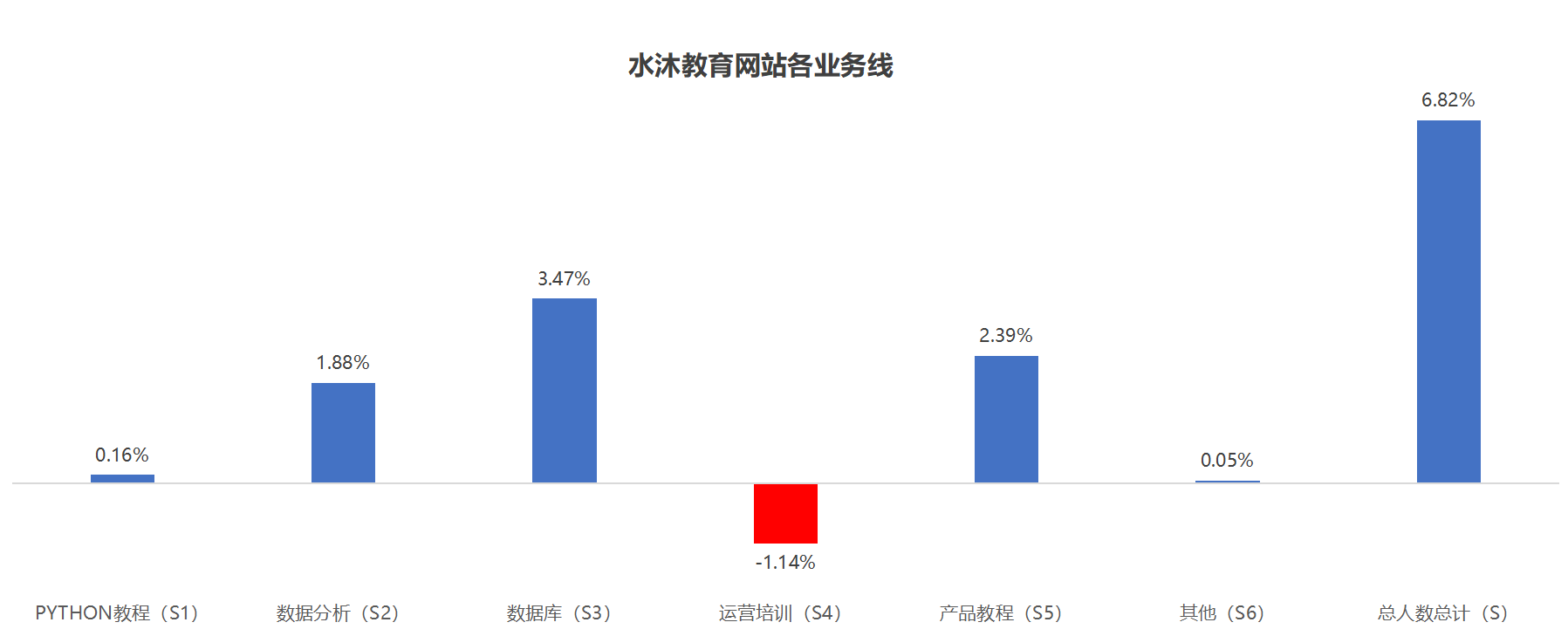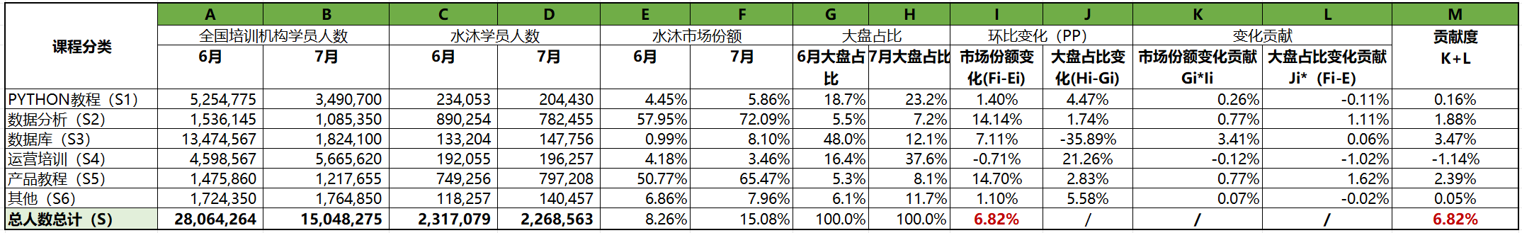 从下图可以看到,水沐教育7月份相比6月份,市场份额增加6.82%,其中增长主力军主要是数据库、产品教程和数据分析,相对而言运营培训对市场份额增长起到了负向作用,拉低了1.14%
