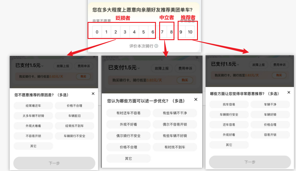 上图的用户满意度调研都使用了NPS模型。NPS全称是Net Promoter Score,即净推荐值,亦称口碑,是计量用户向其他人推荐某品牌/产品/服务可能性的指标,目前已成为国际通用的用户忠诚度分析指标。