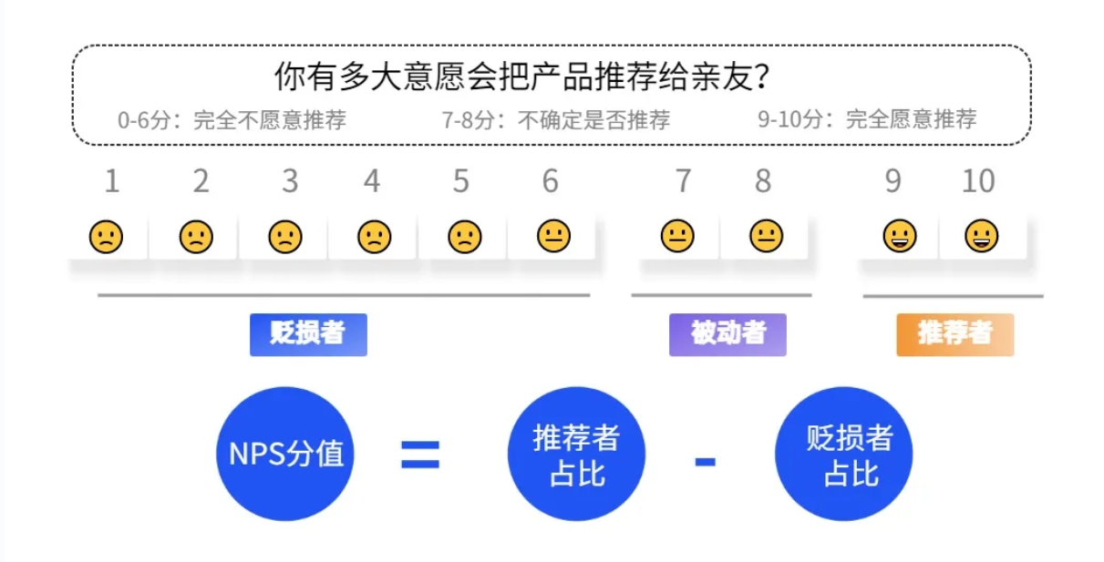 净推荐值=(推荐者数/总样本数)×100%-(贬损者数/总样本数)×100%