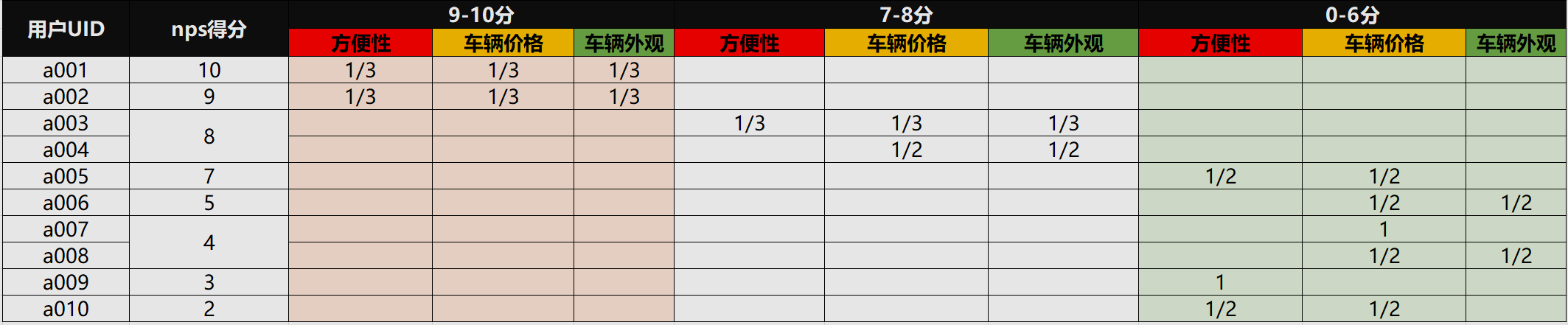 但我们还需要考虑一个问题,即NPS问卷对于Q2中的子项问题是否有选择个数的限制,如果个数限制不是1,则会造成一个推荐者的声音在若干个子项中有所体现,有必要对当前的初始贡献值进行修正。