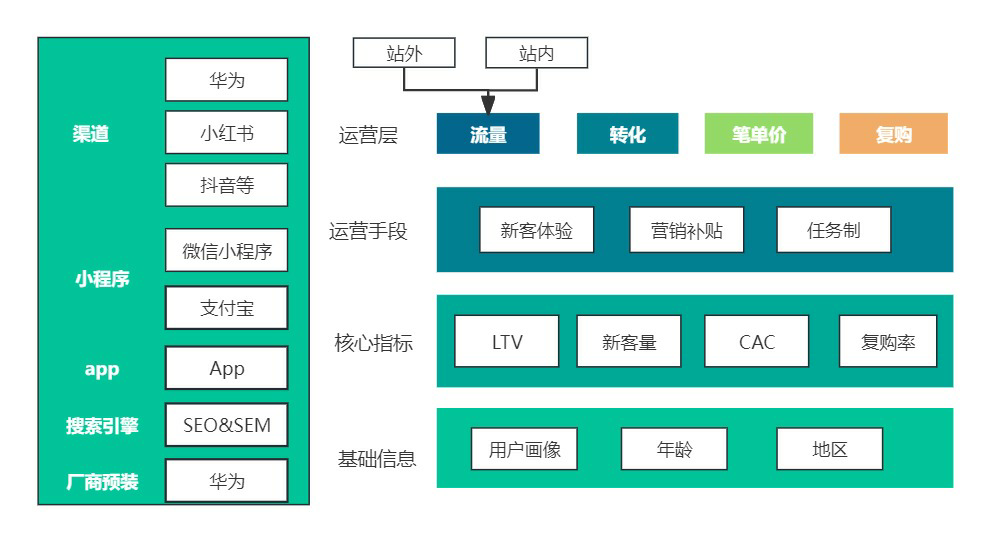 对于新用户而言,常用模型主要包括LTV、CAC模型,通过拆分渠道使用最小MVP跑通每个渠道价值,将有限资源集中到效率最高的渠道,快速提升公司获客效率。