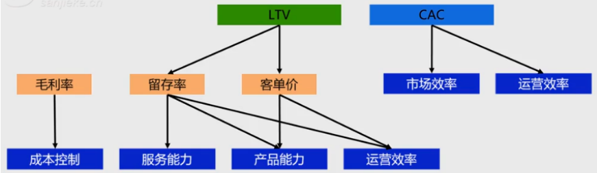 LTV这一侧,毛利率得益于企业整体的成本控制能力,留存率取决于对用户的服务能力、产品设计本身是否打动用户
