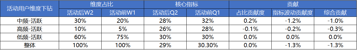 通过数据分析发现,活跃用户下的中频人群指标波动贡献 -1.2% ,对整体影响最大,那么此后,就可以聚焦中频用户策略做进一步展开分析。