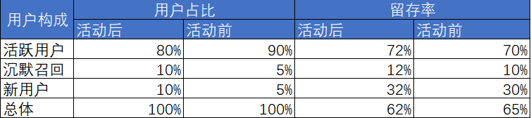 假设数据调整,该群体活动前后用户占比分别为如下: