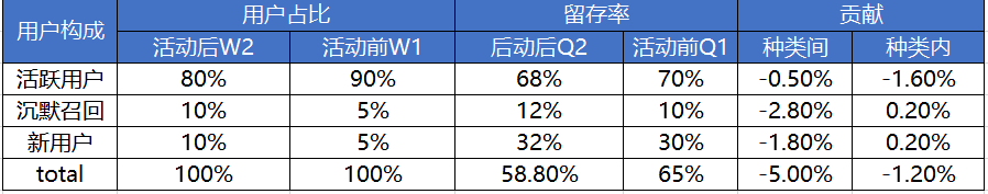 全国大盘活动后相比活动前,留存率从65%下跌了6.2个PP至58.8%,其中用户占比变化贡献了5个PP,用户群体类指标的变化贡献了1.2个PP;