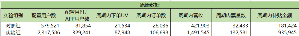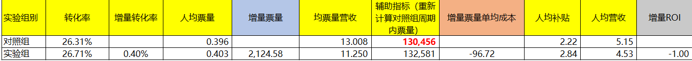 根据公式计算上述数据,运营组在配置策略后,实验组相比对照组的转化率提升0.4pt;增量ROI为-1,相当于付出1元成本带来1元的负营收;增量票量成本为96.72元。