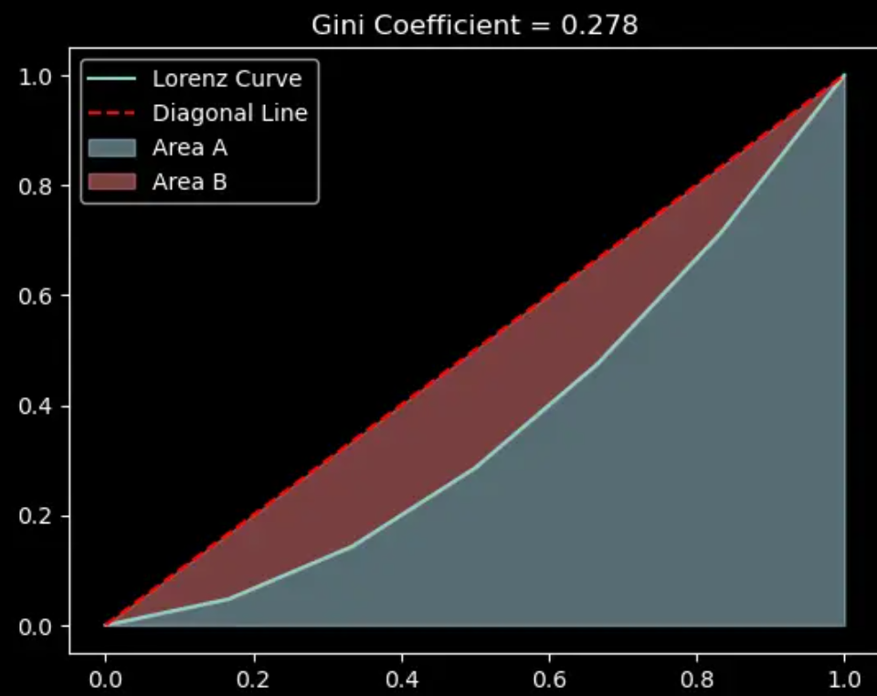 所以最终的Gini系数为0.278。这个结果表示了该财富分布的不平等程度,Gini系数越接近1,表示财富分布越不平等;Gini系数越接近0,表示财富分布越平等。在这个例子中,Gini系数为0.278,说明该财富分布相对较为平等。