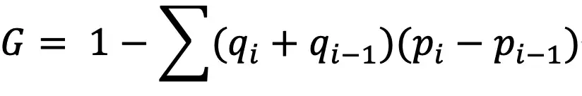 其中 p 为劳伦斯曲线的横轴,q 为纵轴,i 为第 i 个坐标 ,pi 为第 i 个坐标的横坐标,表示累积样本量比例,qi 为第 i 个坐标的纵坐标,表示累积样本数值比例;