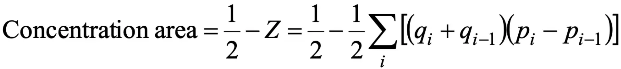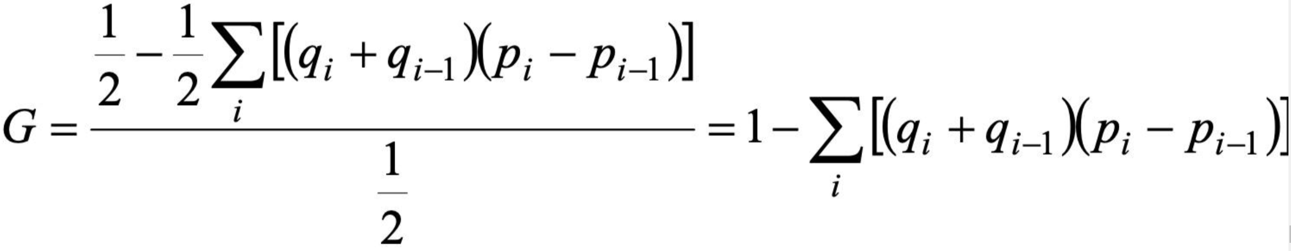 第三步:根据所有Pi Qi 值,根据面积比例公式,计算G值,得到基尼指数,基尼指数越高,代表concentration area面积越大,越接近极端不平等状况。