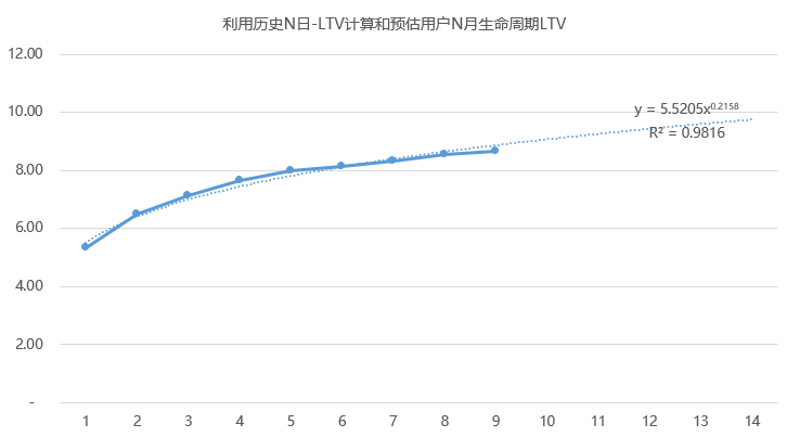 以上步骤后,可以得到拟合函数,R²=0.98,拟合度极高。通过预测LTV,可以知道当第24个月时候,平台用户LTV价值10.96。