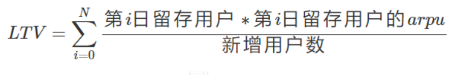 上面公式就是计算某天新增用户中在后续每天留存用户*留存用户的arpu(也就是每天贡献的收入)求和,等价于:LTV=N∑i=0第i日留存率∗第i日留存用户的arpu,如果我们可以根据历史数据预估后续留存率及对应留存日的arpu,那么就可以预估LTV。