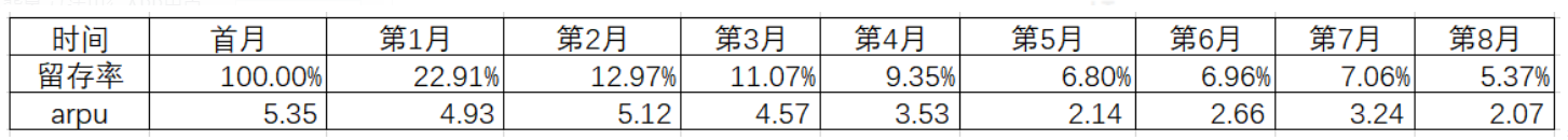 通过计算可知,用户平均生命周期为2.3个月,单月arpu平均值为3.74元,目前LTV约为9元。后续当务之急是尽快提升用户留存率,并进一步做好营收相关工作。