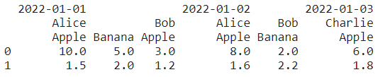 ('2022-01-03', 'Charlie', 'Apple'): [6, 1.8],